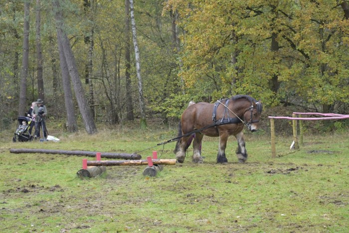 Behalve de oefeningen in het veld, waren er ook twee routes door het bos. Op paadjes van nog geen meter breed trokken de paarden stammen over hindernissen, door water, modder en om scherpe bochten. Steeds waren er juryleden in de buurt om de prestaties te beoordelen. Helaas zat het weer niet echt mee. Het regende bijna voortdurend. Hoewel het zorgde voor een spaarzame toeloop van publiek, leken de paarden zich daar niets van aan te trekken.